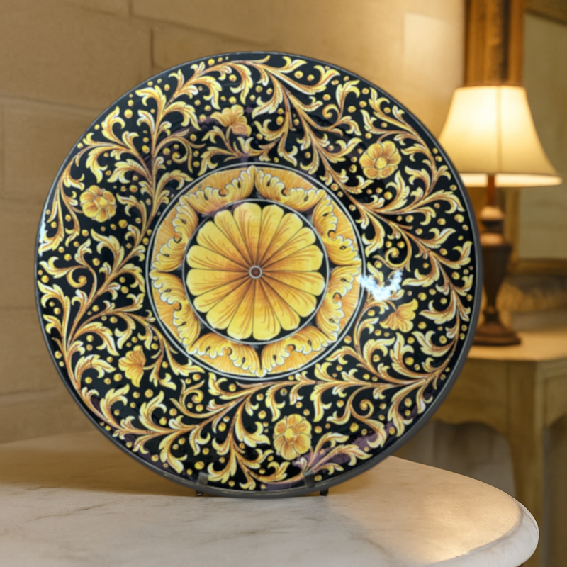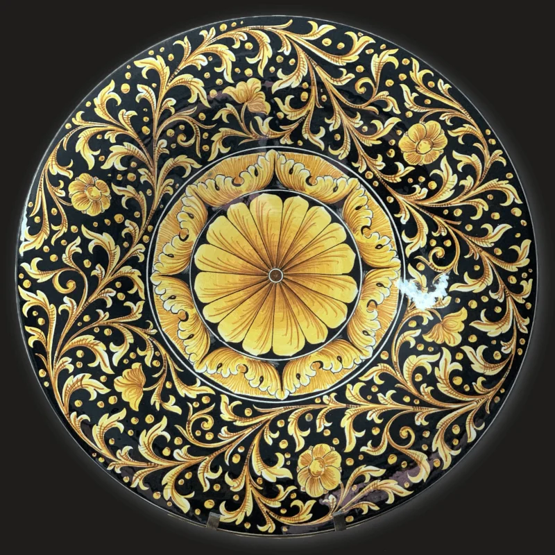 Il motivo ocra intenso che si irradia sul fondo nero lucido conferisce a questo