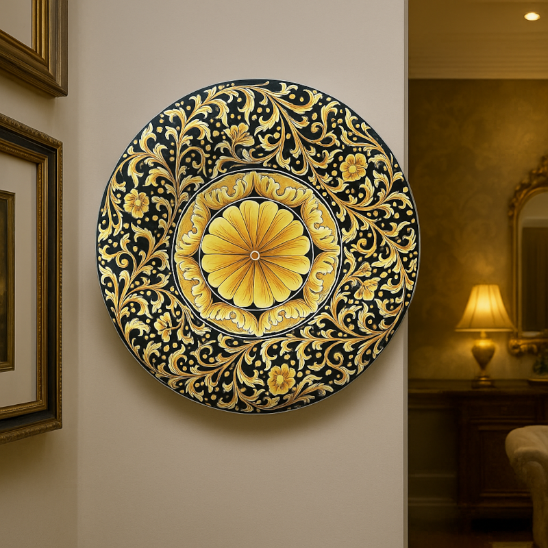 - Parete d’accento: sopra una madia in noce o su boiserie chiara, per un contrasto ricercato che richiama i toni caldi dell’oro antico.